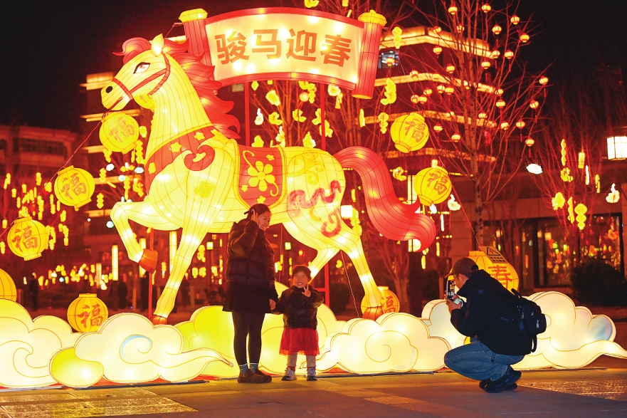 2月14日晚,河津市“鱼跃龙门 幸福河津”春节主题彩灯流光溢彩、年味浓浓。 王若渊摄