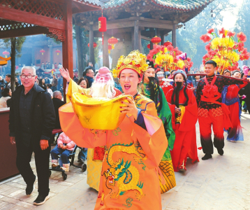 ①正月初五,我国民间有“迎财神”的习俗,当日在运城关公故里文化旅游景区,“财神”打扮的演员给市民送上新春祝福。闫鑫摄
