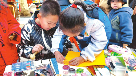 “阿姨,您看这个马纹印章,是我照着古代青铜器上的纹样刻的,过年盖在红包上,既有年味又有文化气息。”四年级学生许予晴热情地向来往市民推介手中的文创作品。