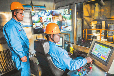 2月18日,工人在平遥煤化(集团)有限责任公司6.25米捣固型焦化改造升级项目1号SCP自动化操控室实施装煤。春节期间,该项目各生产线科学运行,加紧生产订单产品。