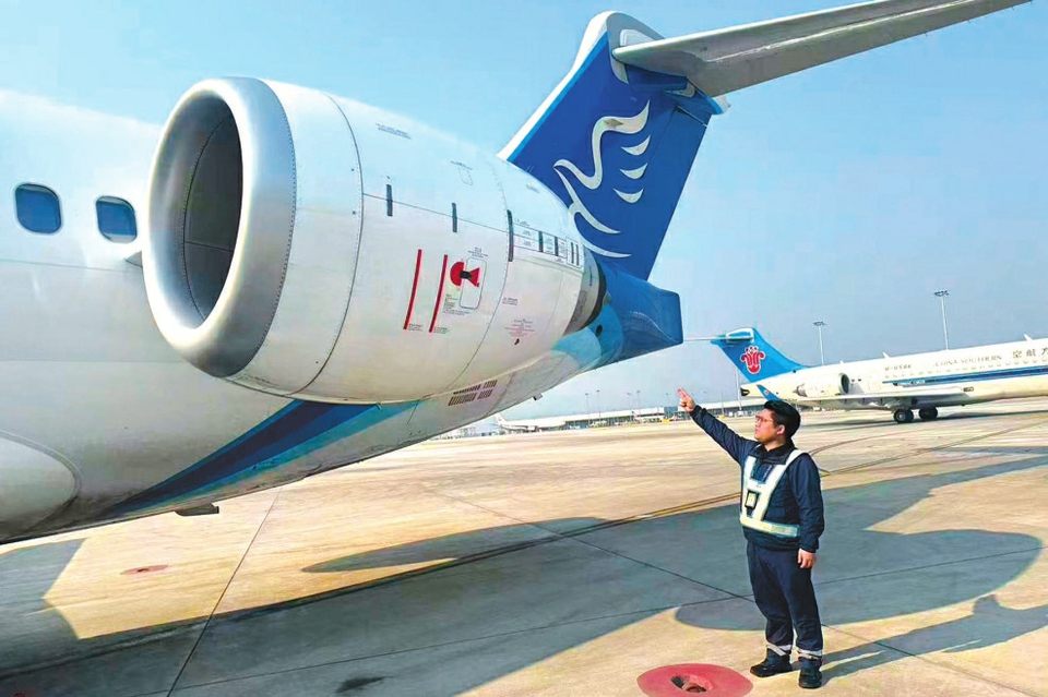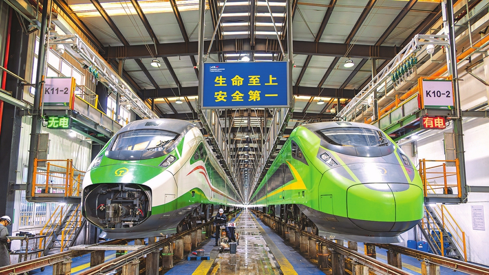 图①:2月18日在中国铁路昆明局集团有限公司昆明车辆段昆西运用车间检修库内拍摄的正在等待检查的“复兴号”动车组。 图②:2月21日,在重庆江北国际机场,华夏航空维修技术员黄伦辉在C909旁工作。 图③:2月19日,在四川省成乐高速公路东坡区段的眉山服务区,工作人员为旅客(左)提供新能源汽车充电服务。 图④:2月19日,在湖北宜昌,船舶有序通过长江三峡双线五级船闸。