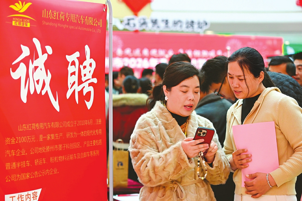 2月22日,求职者(右)在招聘会上咨询就业信息。2月22日,山东省滕州市举办2026年春风行动暨“榴枣归乡”专场招聘会,吸引众多求职者前来应聘。