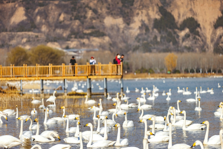 2月21日,平陆县黄河湿地三湾段,大天鹅的灵动身影与澄澈水域相映成画,吸引游客驻足观赏。