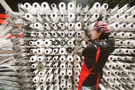 2月24日,在江苏省连云港市连云区一家编织袋生产企业,工人忙着赶制订单产品。