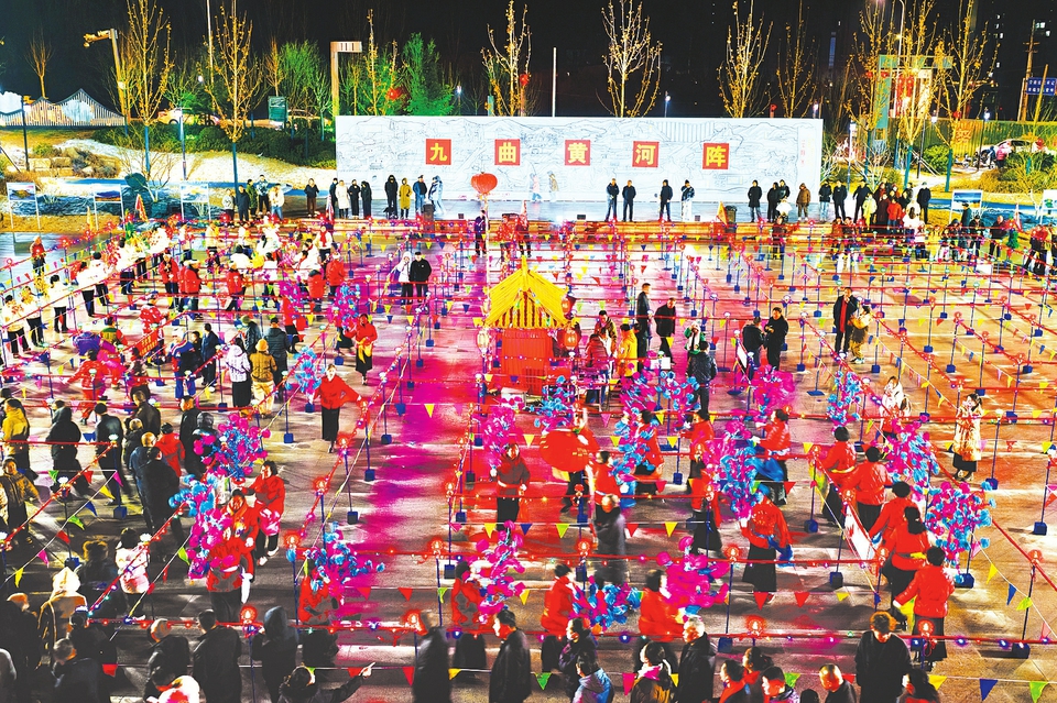2月15日,夜色初临,临汾市古县岳阳园内张灯结彩,管乐声穿透夜空,灯盏如星河洒落园中。“九曲黄河阵”灯会在这里上演,居民游客在蜿蜒的灯阵中“串黄河”,祈愿一年通顺、百病消散。