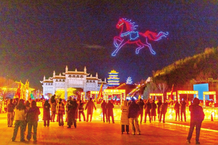 大年初三,孝义市高阳镇金龙山景区热闹非凡,无人机表演和灯展吸引村民及周边县市游客前来打卡。孙燕摄