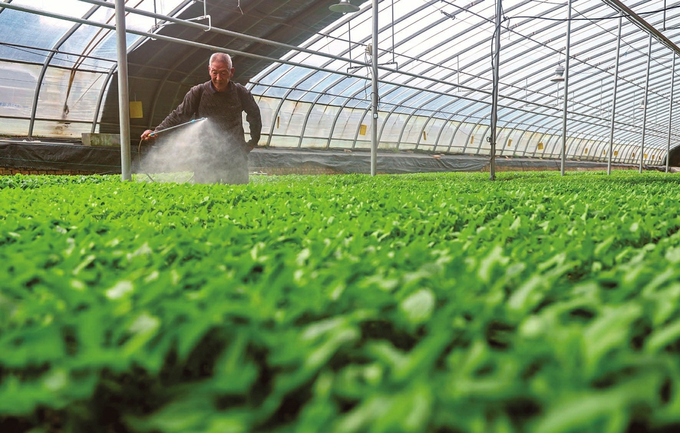 图为2月25日,农技人员在夏县南大里乡夏鲜蔬菜智慧产业园管护蔬菜种苗。金玉敏摄