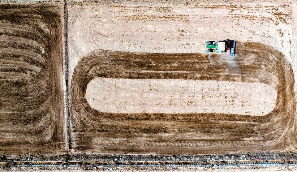 2月24日,在宁夏银川市贺兰县金贵镇银河村,农民驾驶旋耕机平整土地(无人机照片)。近日,宁夏银川市贺兰县的农民积极开展小麦春耕备耕,田间地头一片繁忙的景象。