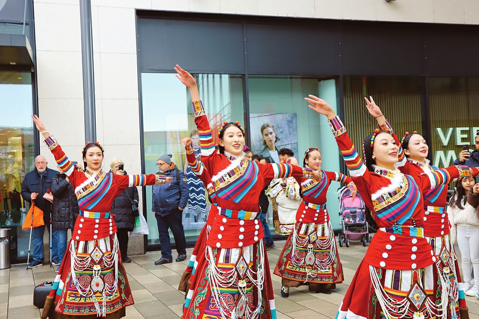 2月21日,中国西藏自治区那曲市艺术团在德国哈瑙市进行表演。