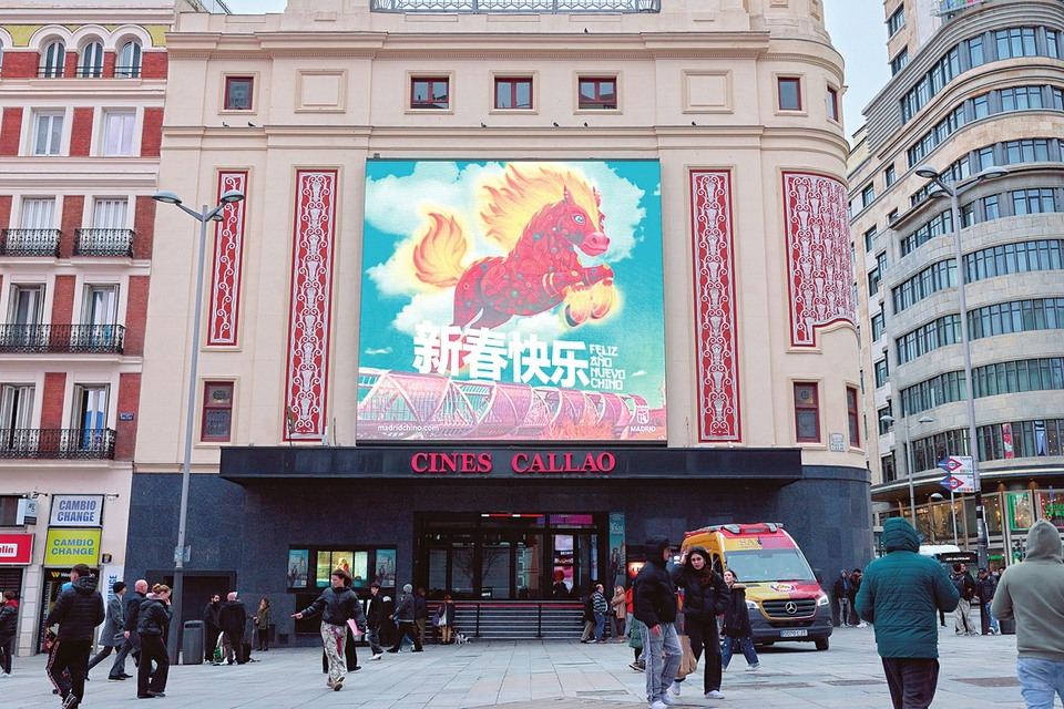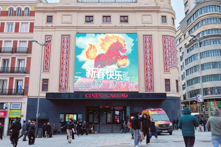 2月11日,西班牙首都马德里街头的一块显示屏播放中国春节主题视频。
