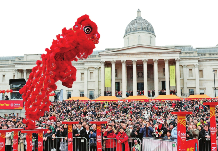 2月22日,演员在英国伦敦市中心的特拉法加广场表演舞狮。当日,英国伦敦特拉法加广场举行庆典,庆祝中国农历春节。