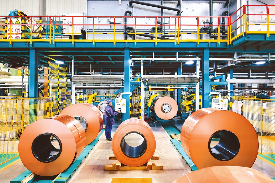 图为2月24日,山西北铜新材料科技有限公司生产车间内,工人正在操作大型设备生产铜带产品。闫鑫摄