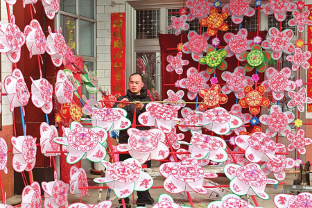 元宵节将至,我省各地群众做花灯、捏面塑、闹红火……欢欢喜喜迎接佳节到来。 图①为2月25日,高平市寺庄镇王报村小学生在积极排练打腰鼓。 图②为2月25日,摊主在方山县国旗广场向游客介绍面塑作品。 图③为2月26日,广灵县剪纸艺人在用刻刀制作剪纸作品。 图④为2月26日,河津市僧楼镇李家堡村村民正在制作花灯。