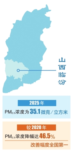 从空间格局看,重点区域示范带头作用凸显,总体呈“南方空气质量好、北方改善幅度大”特点,2025年PM2.5浓度最低的10个省份中南方占7个,“十四五”以来PM2.5浓度降幅最大的10个省份全在北方。“十四五”期间,京津冀及周边地区、汾渭平原两大重点区域,PM2.5浓度分别下降27.7%、32.1%。其中,山西临汾2025年PM2.5浓度为35.1微克/立方米,较2020年降幅达46.5%,改善幅度全国第一。