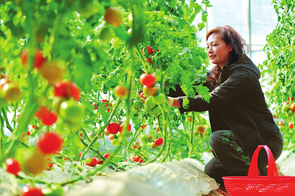 3月1日,太原市晋源区姚村镇西邵村农业产业综合示范园智能温室大棚内,农户正在采摘成熟的普罗旺斯西红柿。该村探索创新“党组织+合作社+公司+农户”模式,流转整合闲置土地120余亩,建设智能温室大棚40座。