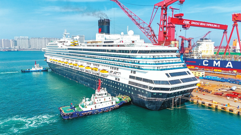 2月28日,“理想”号邮轮完成坞修及保养后准备驶离(无人机照片)。2月28日,“理想”号邮轮完成常规坞修及保养任务,驶离中国船舶集团青岛北海造船有限公司码头。据悉,“理想”号邮轮是来自意大利的10.3万总吨邮轮,2025年12月24日进场开展常规坞修。