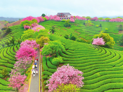 早春时节,福建各地樱花次第绽放,茶园樱花、高山樱花等特色景点游人如织。图为2月28日,游客在福建省漳平市永福镇台品樱花茶园游玩。