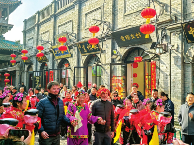 丙午新春佳节期间,平遥古城以一场融合传统与创新的文化活动向海内外游客展现中国年的魅力。图为正月十二,外国游客沉浸式体验平遥中国年。