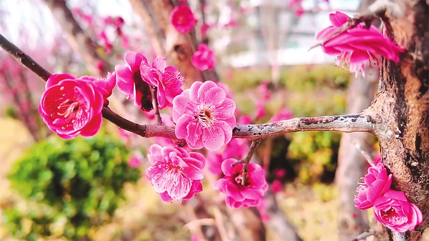 ①早春时节,夏县白沙河湿地公园红梅悄然盛开。含苞待放、恣意绽放的红梅缀满枝头,嫩蕊凝香。蜜蜂在花间穿梭飞舞,灵动又治愈。 ②新春伊始,平陆县300余人奔赴黄河岸边植树增绿。大家分工协作,栽种白皮松、大叶女贞等固土能力强的苗木3000余株,为母亲河筑牢生态屏障。