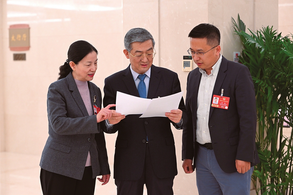 三月五日,出席全国政协十四届四次会议的住晋全国政协委员韩清华、赵建泽、贺晗(左起),小组会后聚集在一起,就能源企业绿色转型、人工智能运用等话题进行讨论。