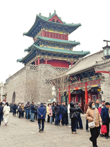 2月28日,雄伟的钟楼下,市民排队购物。柴子贤摄