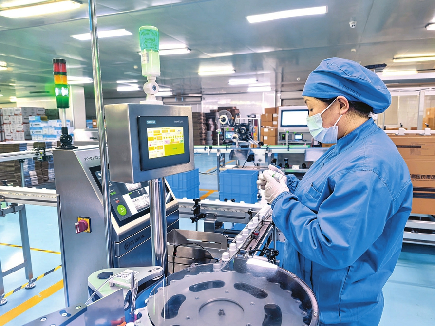 3月9日,临汾市云鹏医药集团生产车间内,15条自动化生产线全速运转,工作人员在岗位上操作设备,有序生产。