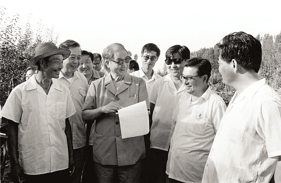 1990年7月中下旬,宋平同志(前左二)来到内蒙古自治区巴彦淖尔市临河区马场地村了解基层党支部建设情况。新华社记者施长江摄