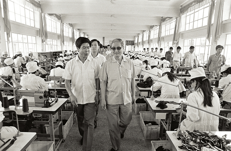 1990年8月14日,宋平同志(右)在山东省威海市文登区考察。新华社发
