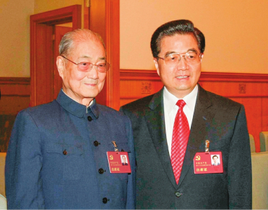 2007年10月21日,在党的十七大闭幕前,胡锦涛同志同宋平同志在一起。新华社发