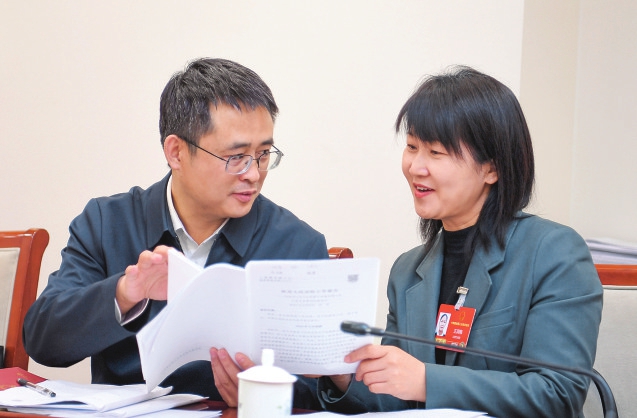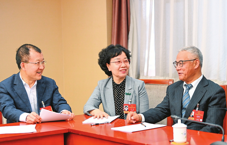 3月10日上午,山西代表团举行小组会议审议“两高”工作报告。代表们围绕报告中提到的“加快推进数字法院建设”展开热议,积极为我省法治建设建言献策。图1为王政涛(左)、辛琰(中)、盛更红(右)代表。图2为朱少辉(左)与王润梅(右)代表。