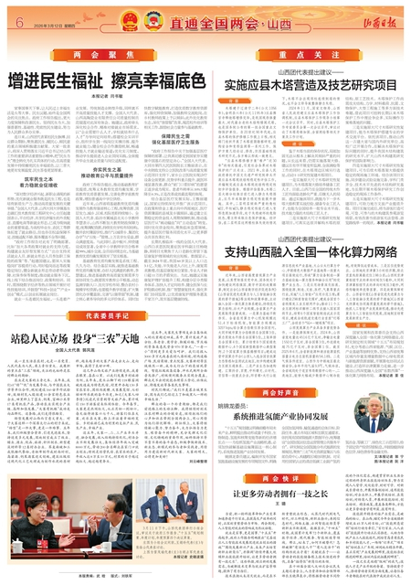 连日来,山西团代表紧扣民生脉搏、回应群众期盼,聚焦惠民生、暖民心、顺民意的重点领域积极建言献策。大家一致表示,将深入贯彻落实习近平总书记对山西工作的重要讲话重要指示精神,把“民生为大”理念转化为扎实具体的行动,在高质量发展中持续擦亮民生幸福底色,让三晋大地更有发展温度、民生答卷更显厚重。