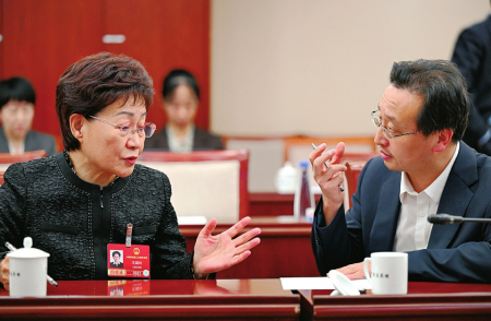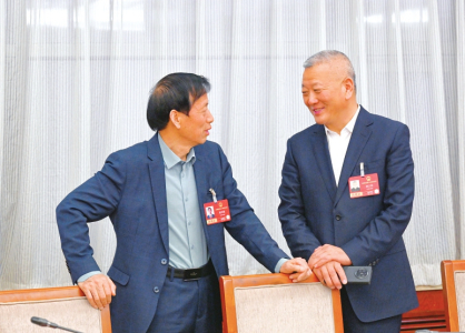3月11日下午,山西代表团举行小组会议,审议关于政府工作报告、“十五五”规划纲要、年度计划、年度预算四个决议草案。 图1为小组会议间隙,王娟玲代表(左)与张临山代表在讨论。 图2为雷茂端代表(左)与胡占军代表在讨论。
