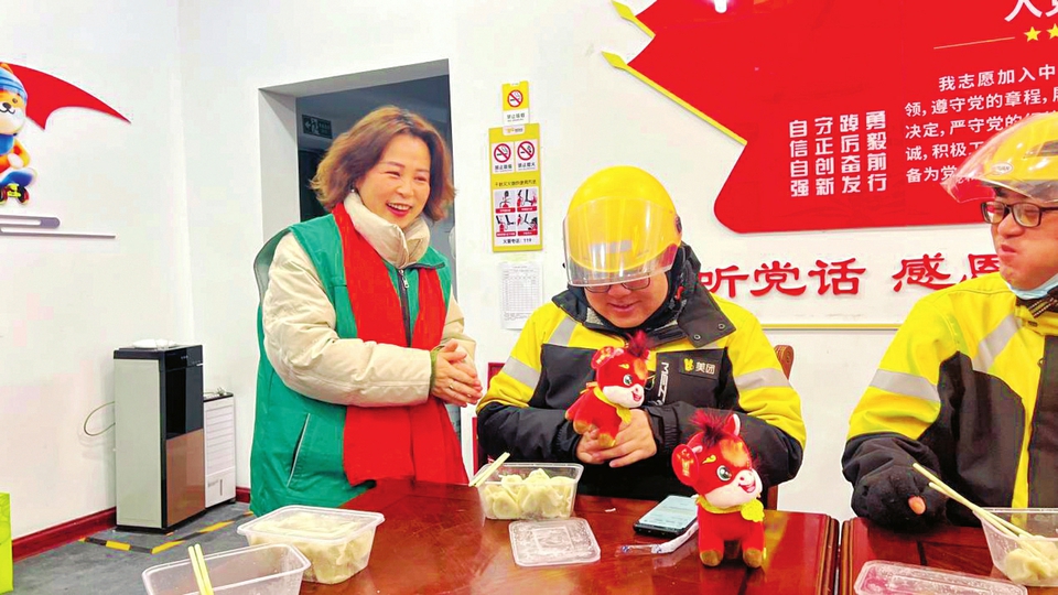 近年来,新就业群体日益壮大,在经济社会发展中发挥着重要作用。我省扎实推进志愿服务体系建设,将社会工作专业人员与志愿者化身为服务新就业群体的暖心力量,解决急难愁盼,让他们感受到实实在在的温暖。图为春节期间,山西尚善社会工作服务中心志愿者在“新光计划”特别关爱行动中,带着刚出锅的饺子和精心准备的“吉祥马”挂件,前往外卖站点,为外卖员送上别样的春节祝福。