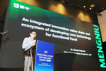 会上,蒙牛集团助理副总裁、营养科学研究院负责人张旭光博士进行了“功能食品核心技术发展的创新价值链与生态圈”主题分享。他深入分析了未来营养健康产业的变化趋势,强调了研发能力与体系的打造是创新发力的基石,布局系统化、层次化、全球化的全链条协作研发体系,建立内外合作共创的共赢模式,是保证核心技术研发成功的关键所在。2023年,蒙牛自主研发的HMO 2'-FL通过国家卫健委审批,成为首批企业中唯一的中国本土企业,打破了国外垄断。