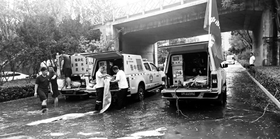 7月3日上午,晋中市榆次主城区多处出现严重内涝积水,接警后市应急救援大队迅速响应,第一时间启动应急预案,拉响事故警铃,紧急调派排涝抢险车7辆、抢险运兵车5辆、山猫装载机1辆、指战员40名,携带潜水泵等排水装备火速赶赴现场进行处置。 图为内涝积水现场。