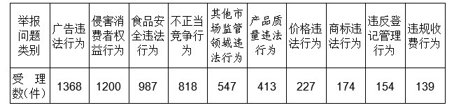 从举报问题分析,广告违法行为占举报问题首位,达1368件,占举报量的20.42%。主要反映问题为:商家在销售中虚假宣传等。