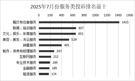 (二)服务类投诉中,排名前三位的热点依次为:餐饮和住宿服务类、教育培训服务、文化娱乐体育服务类。详见图3