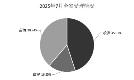 2025年7月份,全省市场监督管理12315机构共接收咨询15972件,同比增加13.60%,环比增加1.95%。从咨询问题的类别来看,涉及市场监管的问题主要有消费维权知识8761件、服务消费监管104件、其他市场监管系统问题97件、商品交易市场监管69件,合计占比56.54%。非市场监管系统6704件。