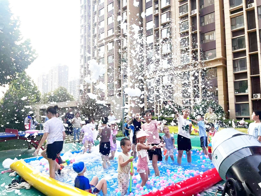 日前,山西乐顺物业管理有限公司在太原市晋源区国雅城壹号院开展了“清凉一夏·欢乐戏水”活动。活动现场,随着巨型泡泡机的全力启动,漫天白色泡泡瞬间将活动现场变成了童话世界。笑声、尖叫声充斥在水枪、泡泡的充气池里,你追我赶,激战正酣……