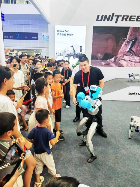 “以前只在春晚见过跳舞的机器人,今天居然看到会打拳的,太新鲜了!”观众李女士举着手机录像,镜头紧紧跟着机器人的每一个动作。不远处的机器狗同样引人关注,通体银灰的机器狗前爪撑地、后肢发力,轻松翻出一个跟头,落地时稳稳当当,还会晃着“脑袋”蹭蹭观众的手心。“能互动的机器狗比电视里看更有意思!”带着孩子来观展的张先生,让儿子与机器狗握手,机器狗立刻坐好,把机械爪轻轻放在孩子的手心,惹得孩子连连欢呼。
