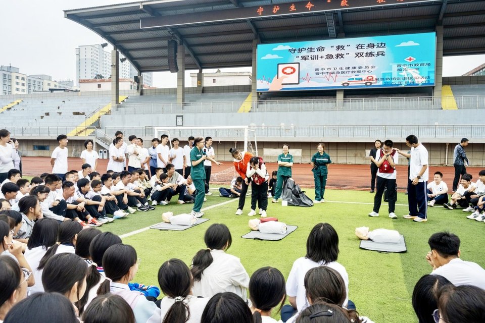 8月28日上午,在晋中市榆次一中的操场上,800多名高一新生分成三组盘膝而坐,全神贯注听着来自晋中市紧急医疗救援中心的讲师演示如何正确进行心肺复苏、使用AED,以及海姆立克急救法等急救操作。这堂与众不同的“开学第一课”,不仅教会了少年们如何挽救生命,更教给他们敬畏与守护生命的勇气。