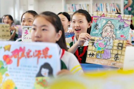 9月10日,是一年一度的教师节。期间,全国各地开展不同形式的主题活动,弘扬尊师重教的传统,传递浓厚师生情。图为9月9日,在安徽省淮北市濉溪路小学,学生展示手工制作的教师节贺卡和绘画。