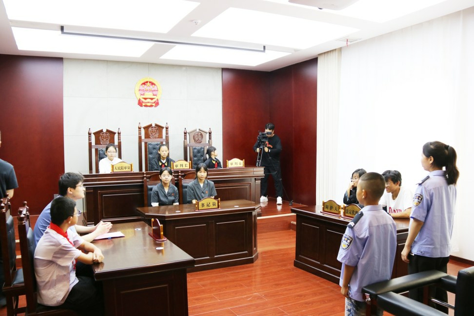 在青少年法治教育主题馆模拟法庭,孩子们沉浸式体验庭审过程