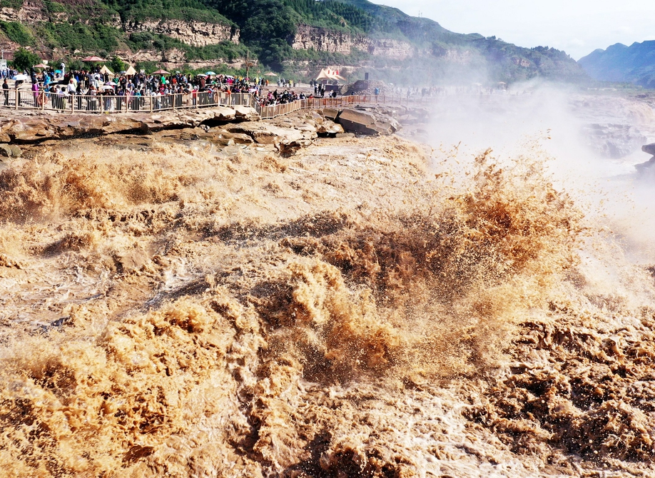 9月23日,游客在山西吉县黄河壶口瀑布景区游览观瀑(无人机照片)。 金秋时节,受上游降雨和水库调节放水影响,位于山西吉县和陕西宜川县交界的黄河壶口瀑布水量增大,气势磅礴。