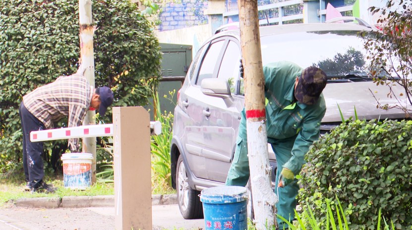 工作人员正在给树木涂白