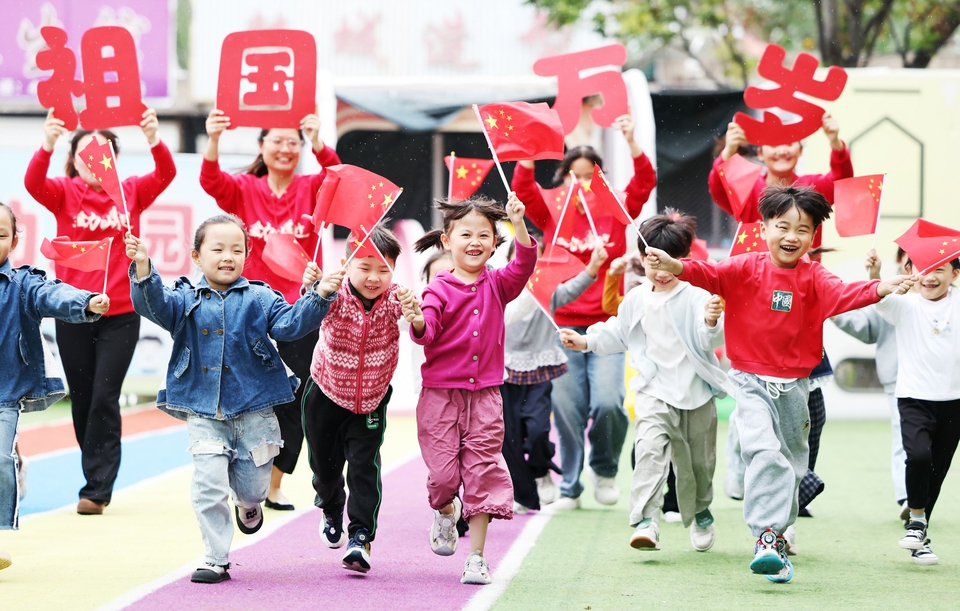 国庆、中秋“双节”将至,人们参加丰富多彩的活动,喜迎佳节。 图为9月26日,山东省临沂市郯城县郯城街道官塘幼儿园的老师和孩子进行课间“快乐跑”。