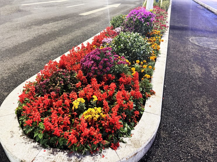 街道两旁绿化带栽种的花朵