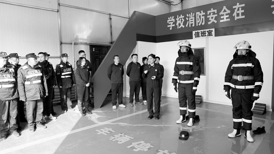 10月24日,朔州市朔城区消防救援大队走进山西工学院为安保人员开展消防演练培训活动。大队培训人员围绕校园内教学楼、宿舍、食堂、实验室等重点区域的消防安全管理要点展开教学。图为现场培训讲解灭火战斗服穿戴整理等内容。