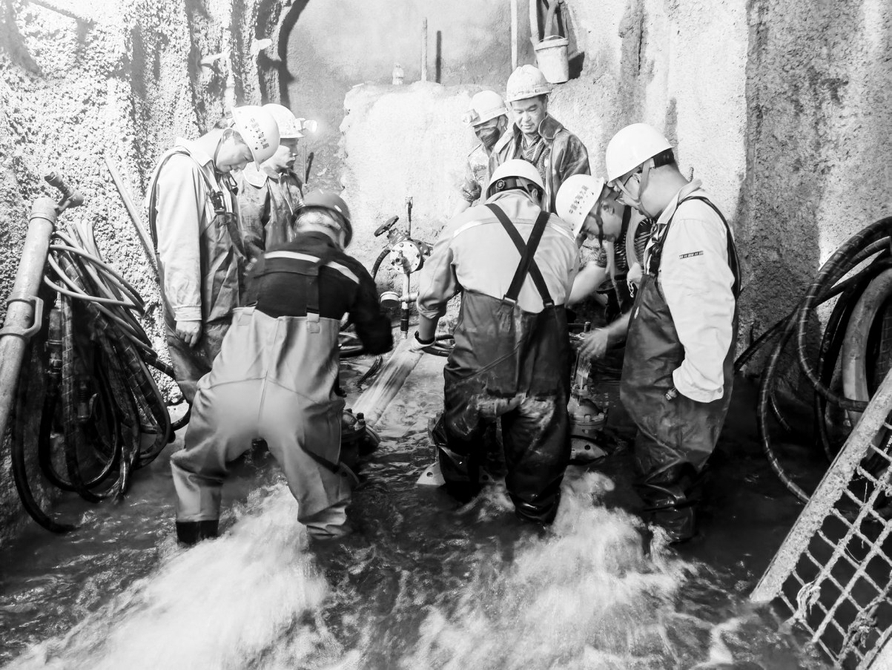 经过4小时紧张奋战,凌晨7:30,出水孔局部封堵完成,险情初步得到控制。但抢险队员们丝毫不敢懈怠,在齐腰深的泥泞中持续加固封堵、加大抽排力度。饿了就啃口干粮,困了就在现场短暂休息,始终坚守岗位。9月5日13点,历经33小时连续奋战,洞内渗涌水终于被抽排至主洞底板,工程恢复施工条件。此次抢险不仅成功抢回工期主动权,更彰显了党员联合先锋队及全体参建者“敢打硬仗、善打硬仗”的过硬作风。