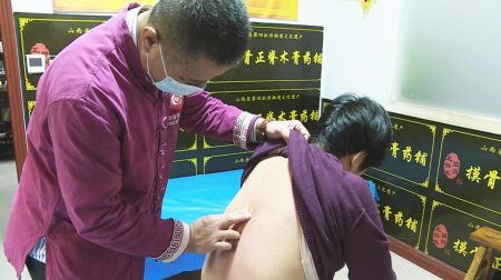 国家级非物质文化遗产摸脊正骨术传承人郭华正在为病人诊治